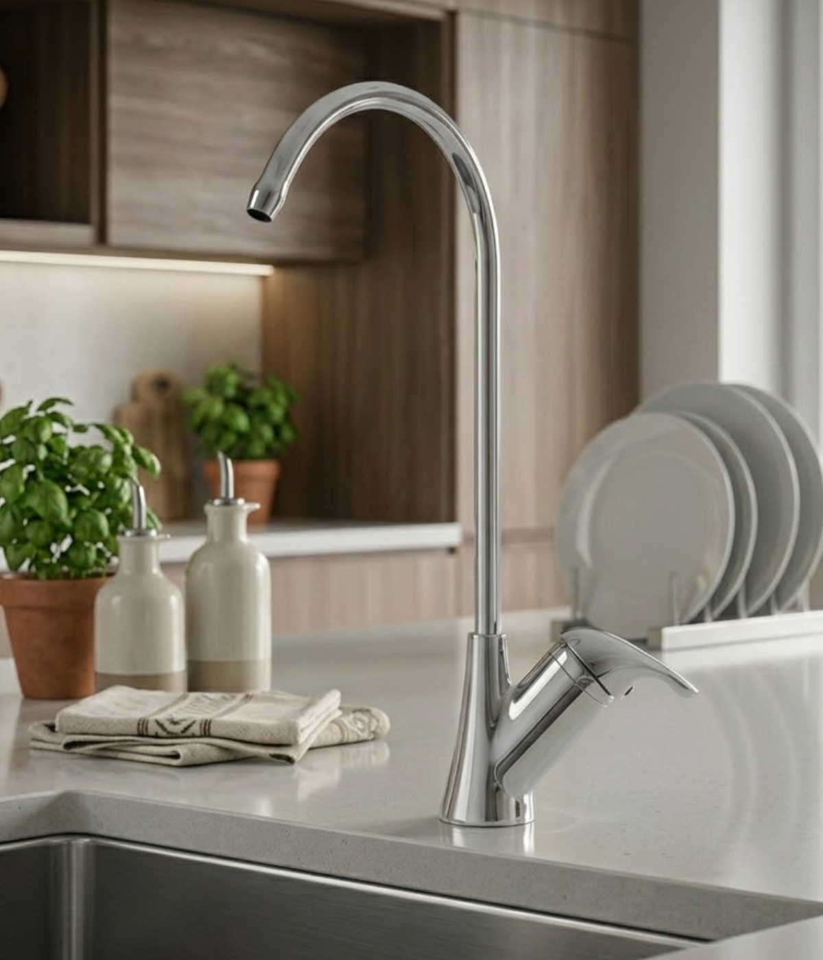 Mutfağınıza modern bir parıltı katın. Zarif tasarımı ve parlak krom yüzeyiyle, temiz suya ulaşmanın en şık yolu.